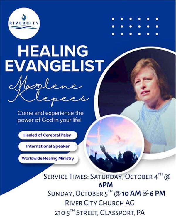 This weekend! Come and hear healing evangelist Marlene E. Klepees.
